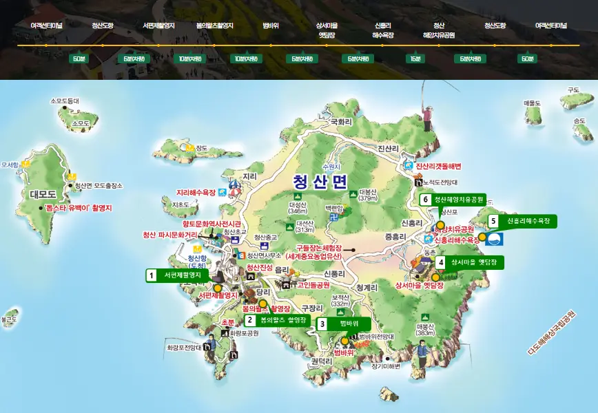 - 연계 관광지: 완도수목원, 청해포구 촬영장, 신지 해수욕장 등