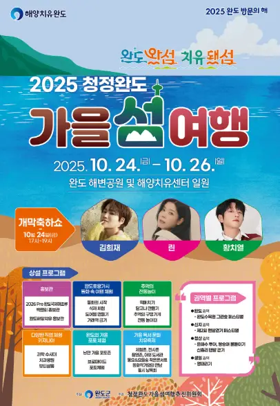 청정완도 가을섬 여행 일정은 2025년 10월 24일부터 26일까지 3일간 진행되며, 장소는 완도 해변공원 및 해양치유센터 일원이에요. 입장료는 무료라서 누구나 가볍게 즐길 수 있습니다. 개막 축하쇼에는 김희재, 린, 황치열 같은 인기 가수들이 출연해 가을밤의 낭만을 더할 예정이랍니다. 가족, 연인, 친구 누구와 함께 가도 좋은 축제죠.